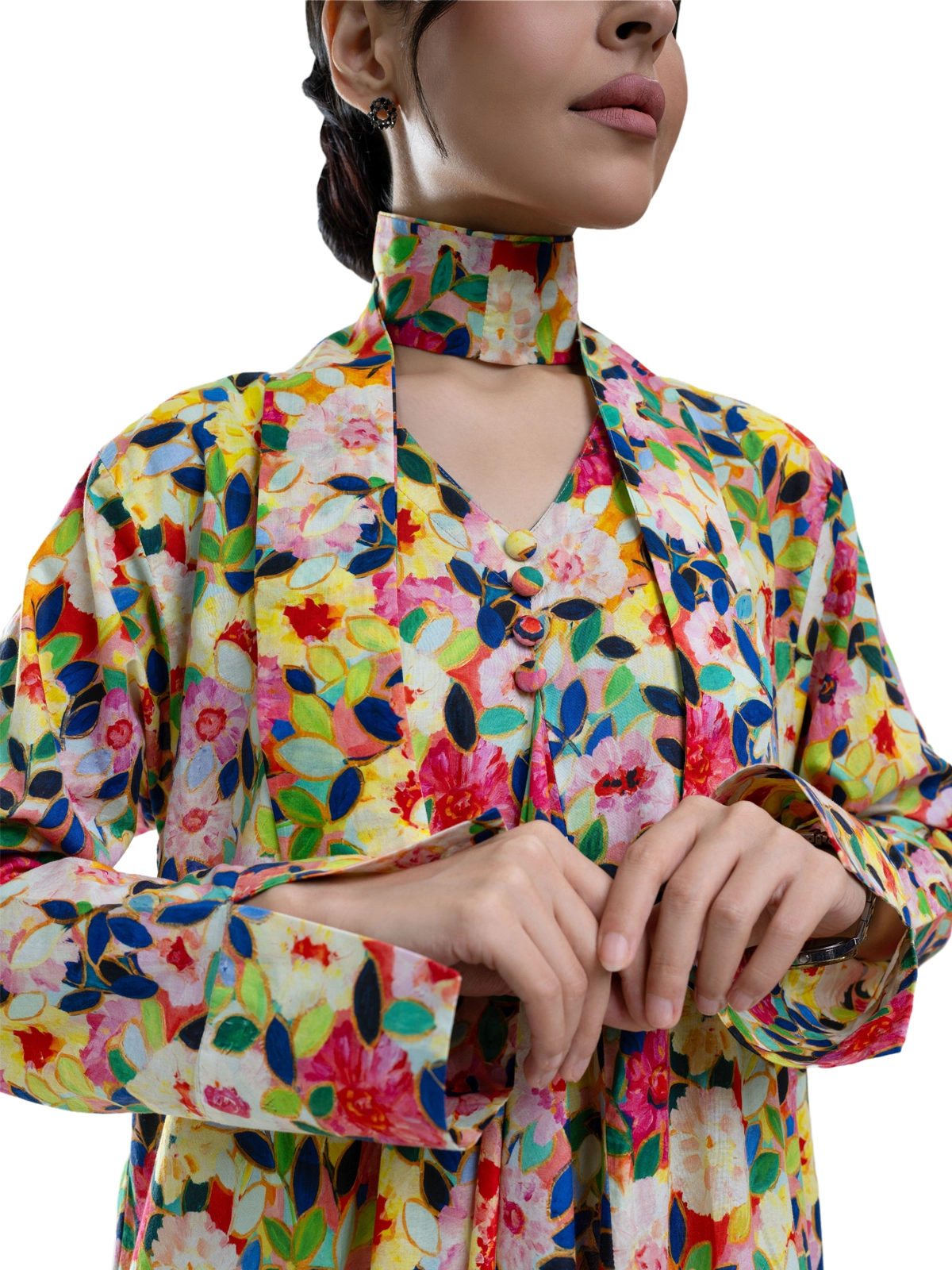 Add a pop of color with this vibrant floral klosh design cotton kaftan, crafted from 100% breathable fabric. Featuring elegant front buttons and long sleeves, it combines comfort and sophistication for casual outings, lounging, or stylish everyday wear.